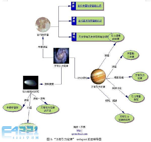 研究性学习作为一种课程理念,可以单独举办综合课程,也可以结合课堂教学或者学科进行,如果将这种理念和网络教学联系起来,就产生了WebQuest。我们根据自己的实际情况,以课堂教学的内容为研究性学习的生长点,以WebQuest为主要学习形式,以思维导图为指导手段,开展了研究性学习,非常受学生欢迎。思维导图在其中的作用是指导学生的探究步骤和探究内容。如图8所示,是结合高中物理"万有引力定律"开展的WebQuest中思维导图主体图。