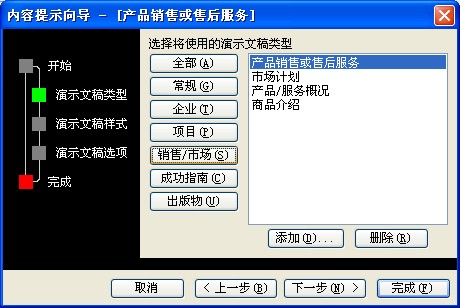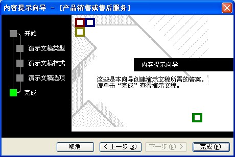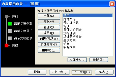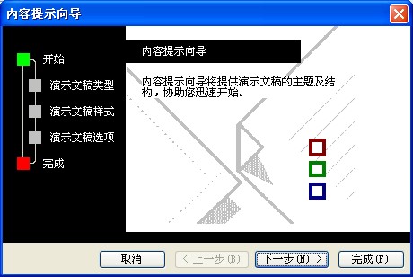 ◇内容提示向导:可直接采用包含建议内容和版式设计的演示文稿,内容提示向导包括不同主题的文稿示例,例如论文、实验报告、培训、贺卡、项目总结等。用户可以根据自己的需要选择一种已婚丧嫁娶的模板,快速创建一份专业的淙文稿。
