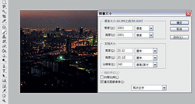 1、我们这里选择的图片是一张夜晚的全景图片。所以首先要对图片进行裁切。截取灯光比较密集,光线比较亮的地方。注意天空的比例尽量小一些。