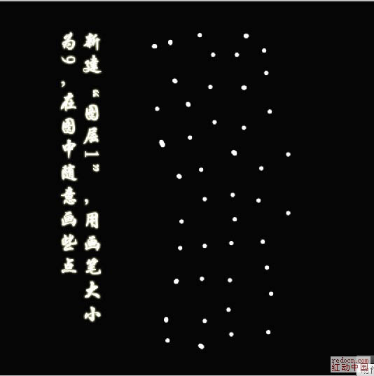 | 2、新建一个图层,得到“图1”,选择画笔工具,笔刷大小设置为9像素,不透明度设置为:100%,在图中随意画些白点,效果如下图。 |