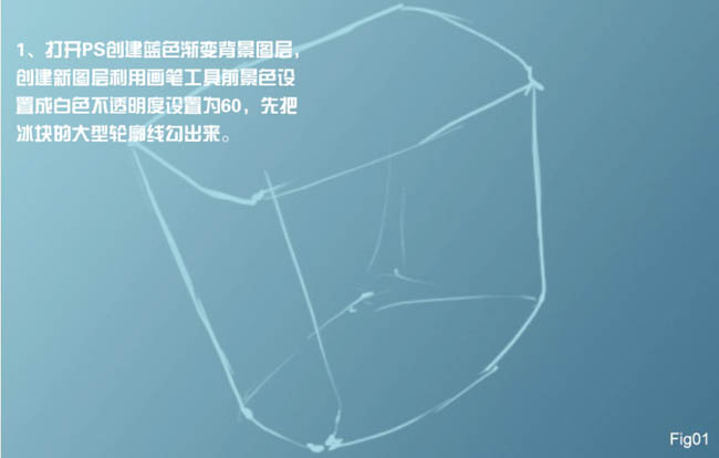 1、打开PS新建一个大小适当的文档,背景拉上蓝色渐变。新建一个图层,选择画笔工具,把前景颜色设置为白色,画笔不透明度设置为:60%,先把冰块的大体轮廓线勾画出了,如下图。