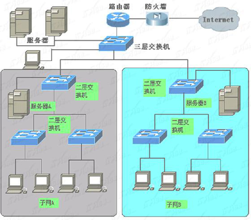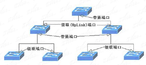 这里的三级并不是说只能允许最多三台交换机,而是从层次上讲只能三个层次。连接在同一交换机上不同端口的交换机都属于同一层次,所以每个层次又能允许几个,甚至几十个交换机级联。层级联所用端口可以是专门的UpLink端口,也可以是普通的交换端口。有些交换机配有专门的级联(UpLink)端口,但有些却没有。如果有专门的级联端口,则最好利用,因为它的带宽通常比普通交换端口宽,可进一步确保下级交换机的带宽。如果没有则只能通过普通交换端口级联了。
