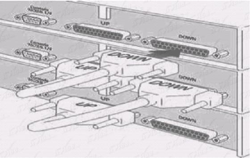 交换机的堆栈连接端口通常是又排D形插孔的,一个交换机有两个这样的端口,分别标有“UP”和“DOWN”字样(如上图所示),表示对应用于向上和向上堆栈连接的,不能接错。