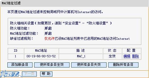 一、选择缺省过滤规则是仅允许已设MAC地址列表中已启用的MAC地址访问Internet