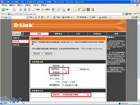 默认情况下DI-524M无线功能是激活状态,默认的无线网络名(SSID)为dlink;默认信道为6;默认无任何安全方式。