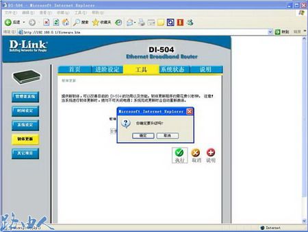 (1)打开浏览器,在地址栏键入192.168.0.1,登录到D-LINK路由器WEB管理界面(默认状态下用户名为admin,密码为空),进入配置界面后,点击上面工具菜单,然后点击左侧的韧体更新按钮;