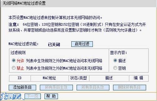 通过有线登陆路由器管理界面,“无线参数(无线设置)”-“MAC地址过滤”,确认其为关闭状态。