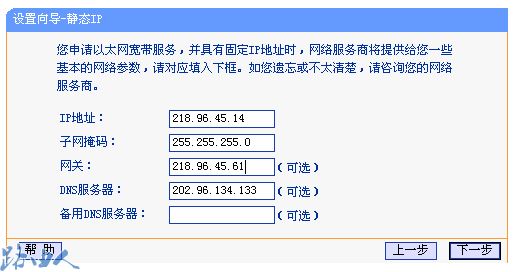 认证登陆TP-LINK路由器的WEB管理界面,通过“设置向导”选择“以太宽带,网络服务商(例如:中国电信)提供固定的IP地址(静态IP)”,设置完成后,然后在IE地址栏里输入任一网址,都会弹出认证的对话框,填入网络服务商提供的拥用户名和密码就可以了。