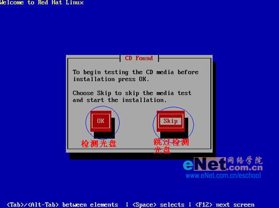 第三步:选择完安装方式后便出现了光盘检测界面,出现这个对话框的意思就是在安装之前确定系统盘是否有损坏,如果确定没有损坏选择“Skip”直接跳过检测进入下个环节。如果选择“OK”则自动转到光盘检测程序自动检测光盘。对于初次接触Linux的朋友,还是建议您在安装之前先检测下系统安装光盘,省去在安装过程中所带来的不便。
