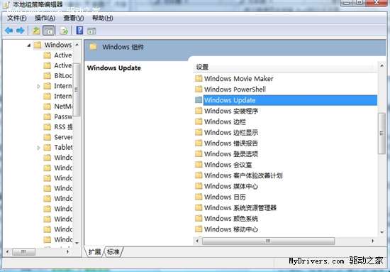 2、在窗口左侧展开“计算机配置”—>“管理模板”—>“Windows组件”,并选择Windows Update;