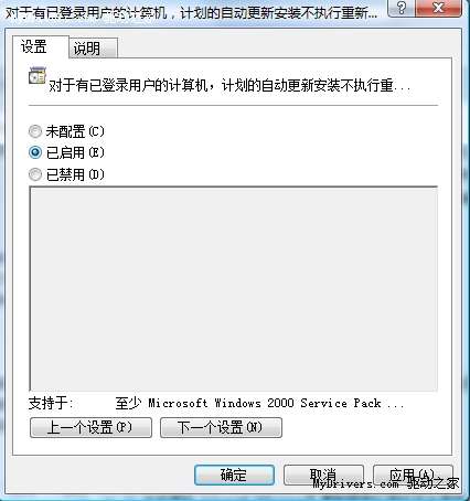 3、在右侧的列表中,找到并双击“对于有已登录用户的计算机,计划的自动更新安装不执行重新启动”选项,在弹出的窗口中改变状态设置,即将“未配置”改为“启用”,最终点击确定,关闭“本地组策略编辑”窗口。