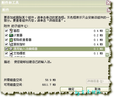 双击附件--找到通用输入法编辑器--钩掉,确定,再找到他勾上,如图: