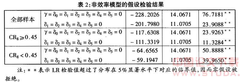 为了验证不同市场竞争程度与外商直接投资技术外溢效应的关系。本文采用Frontier 4.1的计量软件,首先以我国2000—2003年201个四位码制造业行业的面板数据为样本估计方程中的所有参数;其次,计算出2000—2003年四年中201个行业的平均行业集中度,以CR8=0.45为标准将全部样本分为 CR8<0.45(144个行业)和CR8≥0.45(57个行业)两组,检验不同市场竞争程度下,外商直接投资技术外溢效应的变化趋势,估计结果如表1所示。