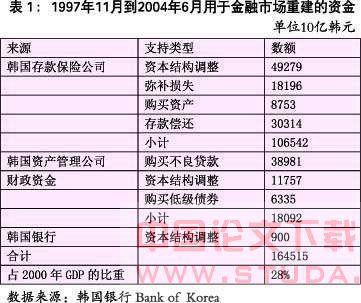 为了稳定金融部门,韩国政府着力解决银行不良贷款问题。政府将8家无清偿能力的商业银行收归国有,经过结构调整,国有银行的比重由1996年的33%增加到2000年54%。这与90年代多数国家国有银行比重下降的趋势相背②。为了重建金融市场,韩国政府花费大量资金,资金不仅来源于国家预算,而且还通过韩国资产管理公司和韩国存款保险公司两家政府机构以发行政府担保债券的方式进行筹集。到2004年底,为稳定金融市场,韩国政府投资达165兆韩元,这相当于韩国2000年GDP的28%(见表1),扣除收入政府应对危机的成本占GDP的比重大概为22%。从财政成本角度,韩国危机称得上是最昂贵的金融危机之一。