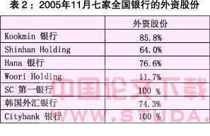 1999年12月,韩国第一银行卖给一家美国基金新桥资本;2000年11月,Koram银行卖给了美国投资基金Carlyle,2003年9月,韩国外汇银行卖给了美国Lone Star投资基金。从2001年开始,韩国银行部门的外国证券投资迅猛增加。到2005年末,在剩余的七家全国性银行中,有六家的外国股权比率超过 50%。总体来看,外国投资者拥有韩国商业银行的股权比率高达66%,比1998年提高46个百分点(见表2)。