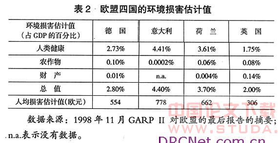 以上两种方法的实证结果不能作系统比较,原因有三:一是涉及的国家不同。GREENSTAMP只有捷克的实证数据,而GARP II提供了德国、意大利、荷兰、英国四个国家的相关数据。二是考察的污染物不同。大体来说,两种方法都是把注意力放在对大气污染的计量上,而没有考虑相同的污染物。GREENSTAMP着重考察了SOx和NOx的排放量,而GARPII没有估计NOx的相关损害。尽管有关于臭氧的数据,但是NOx的排放量与臭氧的水平之间的关系很难建立。另外,假设PM10及SO2都在臭氧的形成过程中起作用,把NOx作为臭氧的先行者进行相应的损害计算,将会导致重复计算的问题。三是对污染物的处理方式不同。GREENSTAMP分析实际的排放量数据,而GARP主要考虑污染物造成的损害影响。