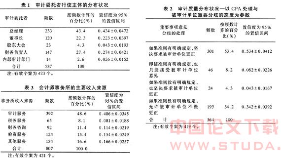 审计委托模式之所以对CPA的职业态度和执业质量产生至关重要的影响,在于审计收费是会计师事务所最主要的收入来源。在有效的423份调查数据中,421名CPA对本所主要收入来源作了回答,详情见表3。由于审计业务几乎关系到每一家事务所的生死存亡,在管理当局控制着审计委托权的时候,会计师事务所和CPA在与公司管理当局的博弈中常常处于弱势地位,从而无法保持应有的独立性,不得不出具管理当局偏好的审计报告。