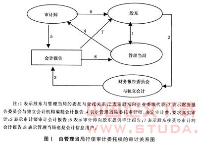 以上理论研究的成果和成功的企业实践从不同的角度证明由独立的财务报告委员会行使会计流程控制权的可行性。当企业由财务报告委员会和独立会计机构全程负责会计信息生产后,审计委托权将不再是一个敏感的话题,对高质量审计服务的需求是会计信息供需双方的共同选择,此时审计委托权由会计信息的任一需求方行使都会带来相同的结果。审计又回到了最初设计的正确轨道上,虽然审计委托人不一定是股东。当然,比较而言,管理当局继续行使审计委托权的交易成本最低。由管理当局行使审计委托权的审计关系如图1。
