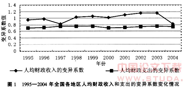 图1描述了1995—2004年全国各地区人均财政收入和支出的变异系数变化情况。从中可以看出,在中央政府对地方政府转移支付后,全国各地区人均财政支出的差距不仅没有呈现减小的趋势,反而地区间的差距在不断拉大。也就是说,如果考虑到提供同样使用价值的公共服务所面临的成本问题,实际的公共服务差距比人均财政支出反映的差距还要大得多。
