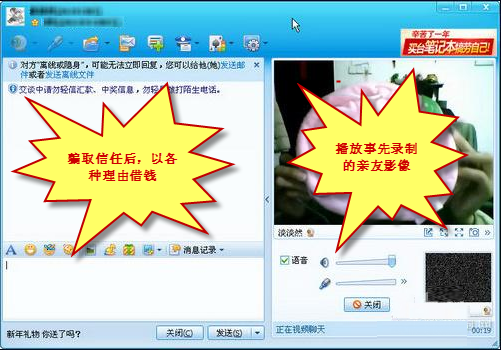 分明QQ视频画面中的人是自己的亲友,但自己却被骗取钱财,这是怎么回事呢? 近期,腾讯公司接到用户举报,反映有不法分子利用“QQ视频”进行钱财诈骗。以往,不法分子通常盗取用户QQ号,再与用户的好友文字聊天、取得信任,然后骗取钱财。与文字聊天诈骗相比,这种新型的视频诈骗方式更加隐蔽,关键是有亲友聊天的真人视频画面迷惑,于是未经和亲友电话确认,匆匆汇款从而落入圈套。在此提醒广大用户留意分辨以免造成损失。 那么不法分子是怎么实施视频诈骗的呢? 1、与某人QQ视频聊天或采用特殊视频录取软件,录制对方的视频影像。 2、盗取对方的QQ号码并获取个人信息。 3、与对方的好友聊天,通过播放之前录制的视频影像给其好友观看,骗取其信任。 4、以急需用钱为名向对方的好友借钱,达到诈骗钱财的目的。 为防止露出破绽,有时不法分子会以话筒损坏等为由,避免语音聊天。另外,有的不发分子还会借取得信任之机,传送木马病毒文件,从而盗取用户机器上的网上银行、网游帐号、邮箱等个人帐号资料,给用户造成极大损失。 再次提醒广大用户,遇到亲友QQ上借钱时,务必留意分辨、通过多种方式核实真实情况,针对“视频聊天”,可以要求对方做一些动作以分辨视频真伪;最好是通过电话直接和亲友确认。 针对不法分子越来越多得利用QQ进行网络诈骗的现象,腾讯公司会采取技术手段,加强对用户的提醒和保护,也请广大用户不要随意接收对方传来的文件,很可能是盗号木马病毒。同时,请广大用户安装杀毒或安全防护软件,如最新版的QQ电脑管家(http://pcmgr.qq.com),可以有效防护、查杀木马,杜绝木马病毒的危害。