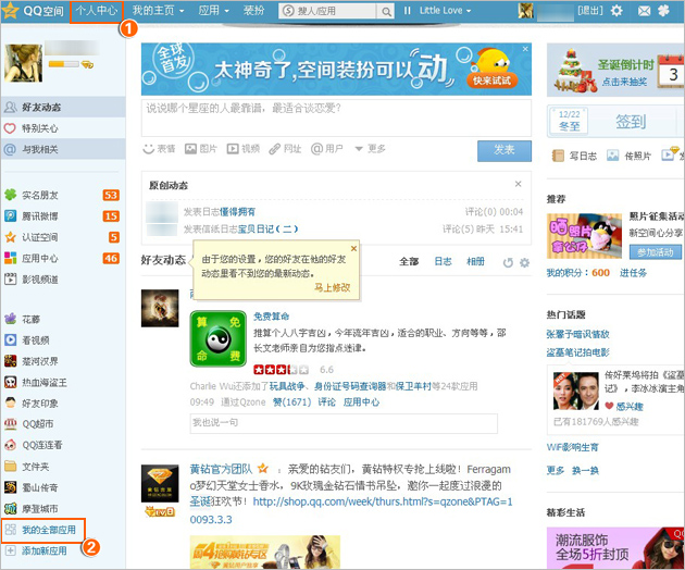 如何隐藏QQ空间个人中心的应用?